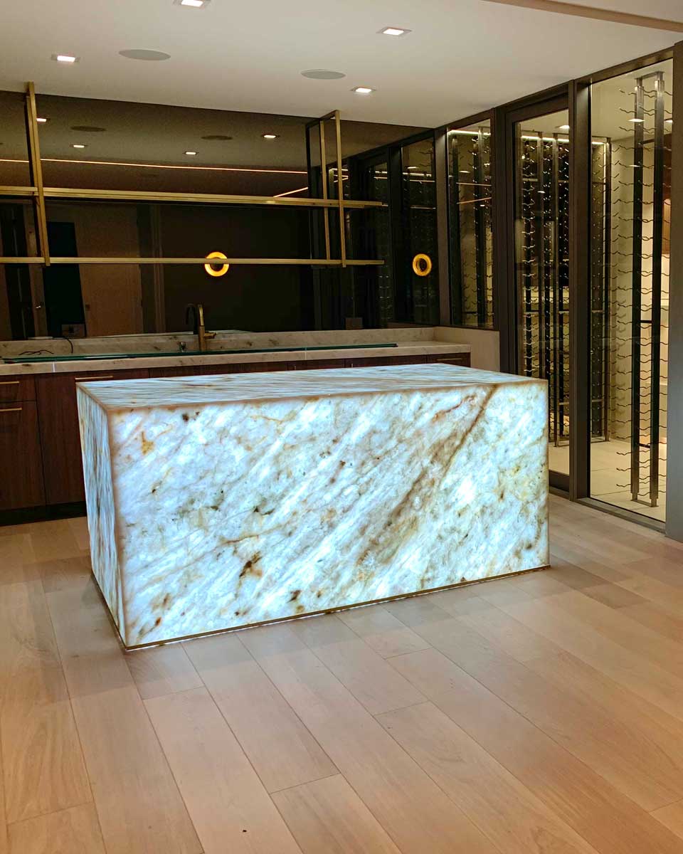 Backlit Stone Bar & Modern Glass Wine Room Installation