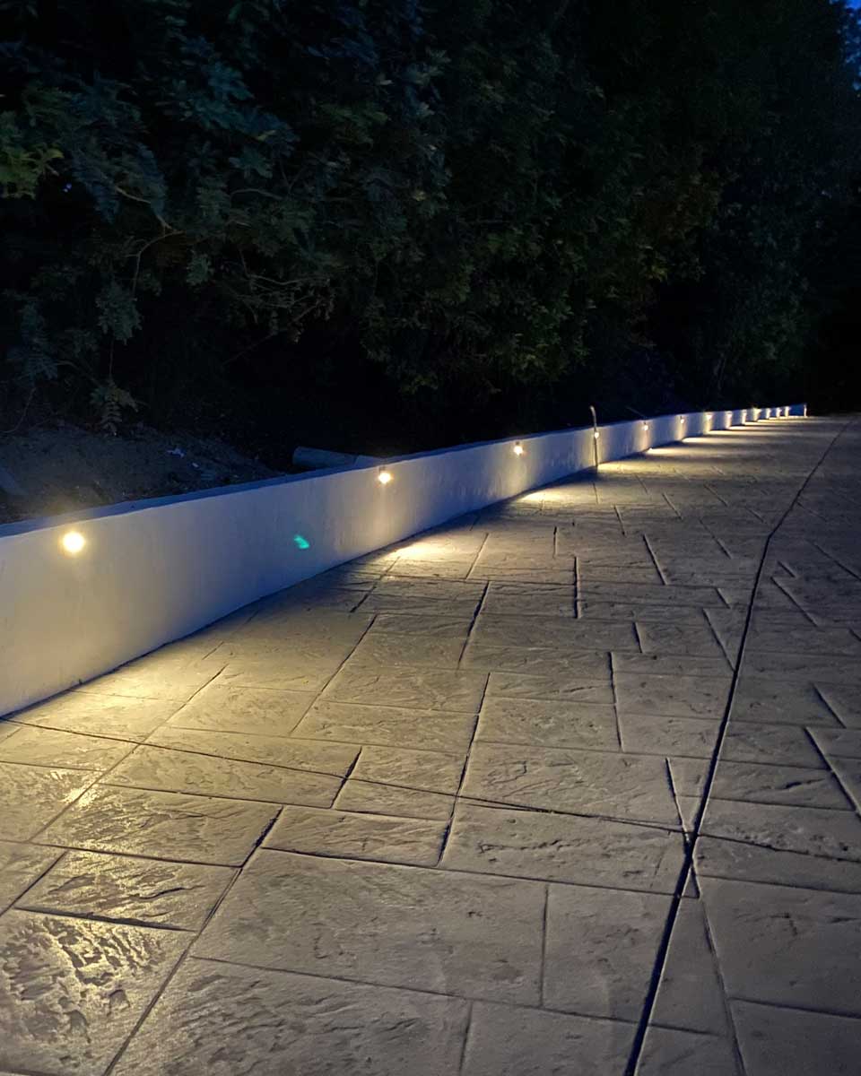 This elegant outdoor lighting project enhances both safety and aesthetics with a seamless, low-voltage LED system. Soft, warm illumination is integrated directly into the retaining wall, creating a continuous guiding glow along the driveway. The result is a modern, high-end look that beautifully highlights the surrounding landscape while ensuring clear visibility at night.