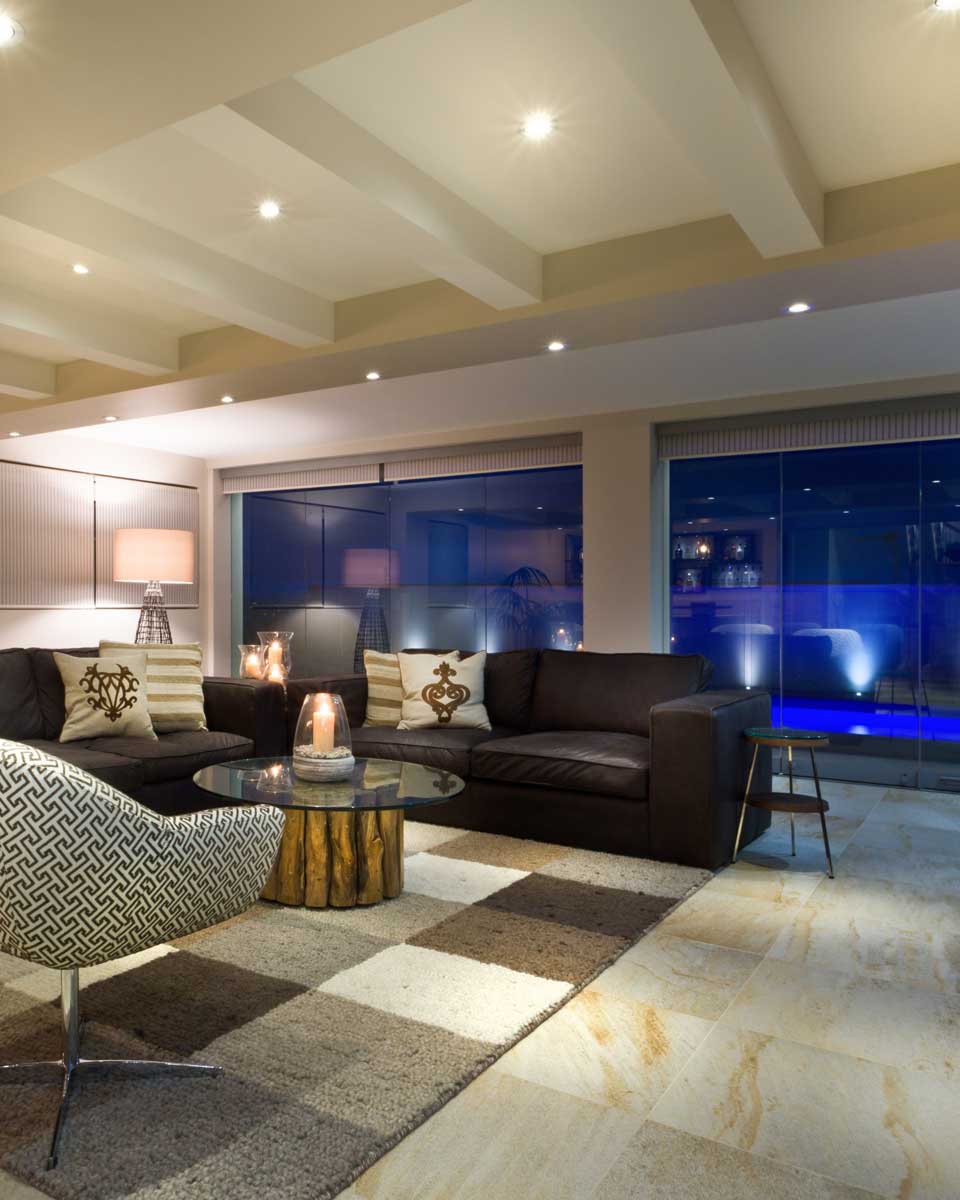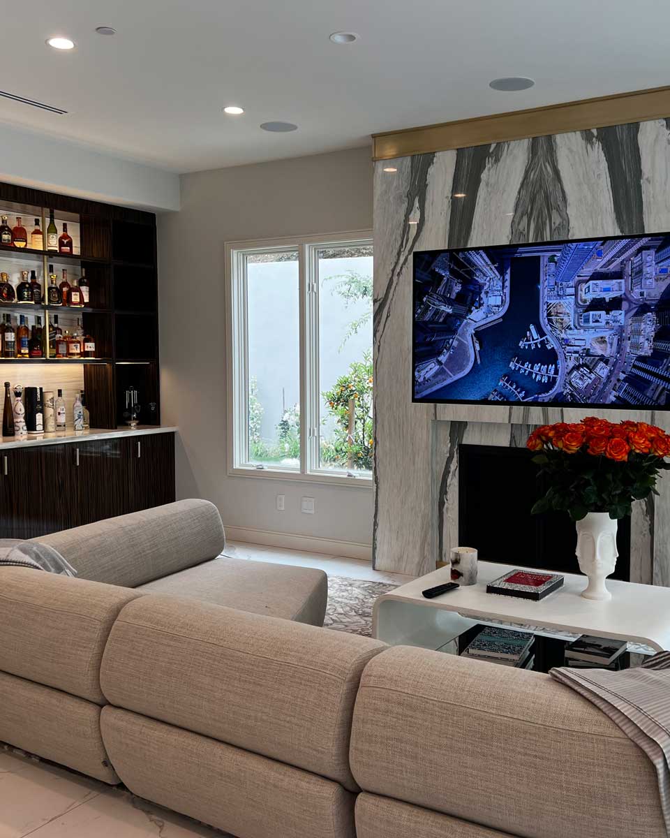 This refined living space combines high-end audiovisual integration with elegant interior design. A sleek wall-mounted display is set against a dramatic book-matched marble feature wall, creating a bold focal point without visible wiring or clutter. Integrated ceiling speakers provide immersive whole-room audio, perfectly balanced and discreetly installed for a seamless aesthetic. The custom-built bar area includes precision LED backlighting that highlights premium finishes and enhances the ambiance. Every detail—from cabinet lighting to speaker placement—is engineered to elevate both the visual experience and functionality of the room.